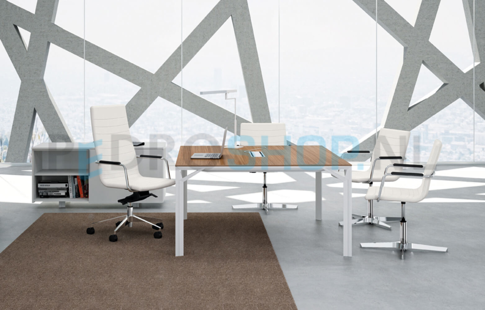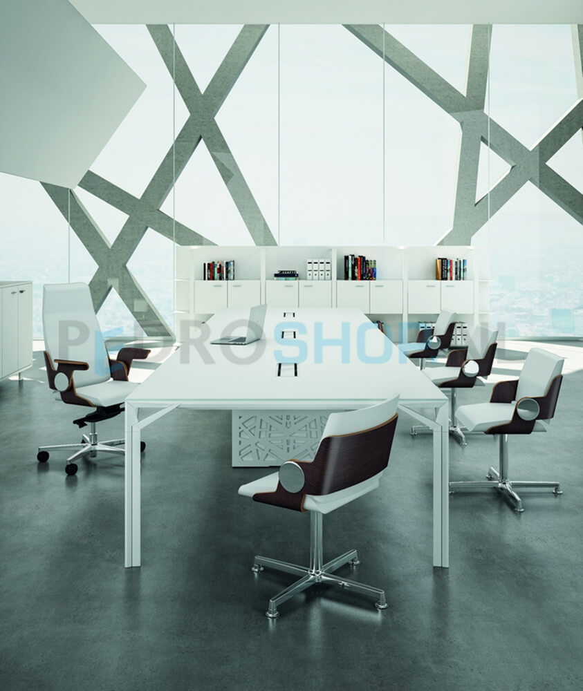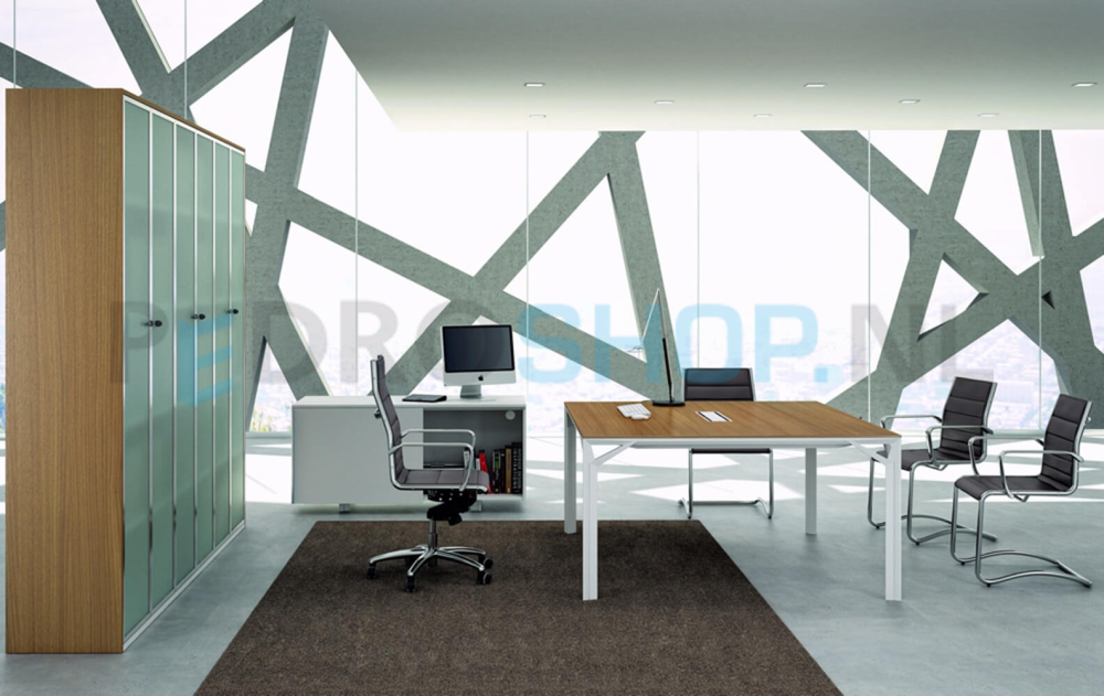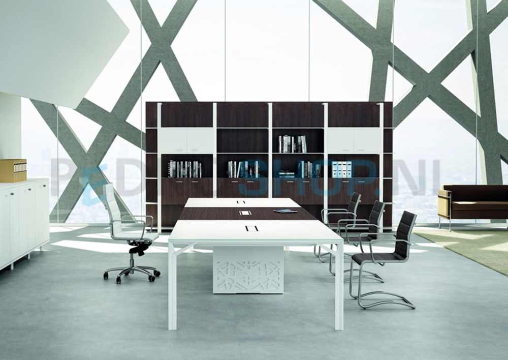 De exclusieve management-lijn van het Italiaanse Officity, strak en puur design. Massief aluminium frames in mat wit of mat donkergrijs (shadow grey) met 10mm dunne geprofileerde bladen van melamine, glas of gelakt hout. Levertijd 4-6 weken.